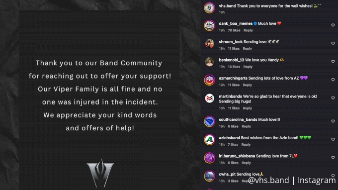 In true fashion for the Marching community, an outpouring of support has come from every corner of the activity, with many fans and fellow programs showing their support for Vandegrift on a recent post made by the Viper Band.